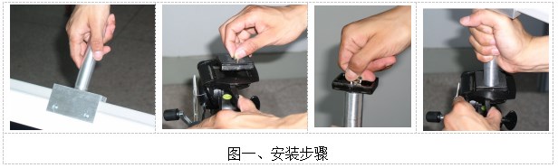 c. 取出三腳架并支起,在三腳架的頂部有一片帶螺釘的云臺,可以松開取下。取下后將其螺釘旋入手柄底部的螺孔內,然后按原樣卡回三腳架上。