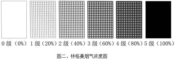林格曼煙氣濃度圖是十九世紀末法國的林格曼(Ringelmann)提出的。這種方法是把圖放置在適當的位置上,使圖上的黑度與煙氣的黑度(或不透光度)相比較,憑視覺進行評價。林格曼圖有多種規格,我公司繪印的是通用標準形式,它由14cm×21cm的黑度不同的六小塊組成。除全白與全黑兩塊外,其他四塊是在白色背底上畫上不同寬度的黑色條格。根據黑色條格在整個小塊中所占的面積的百分數分成0至5的林格曼級數。0級是全白,5級是全黑,1級是黑色條格占整塊面積的20%,2級占40%,以此類推,如圖所示。