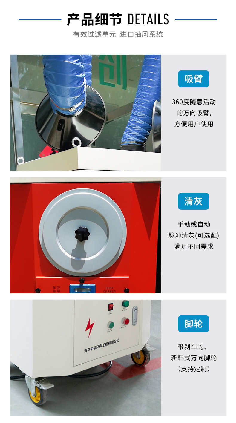 3、利用可360度隨意活動的萬向吸臂,可從煙氣發生處吸除煙氣,大大提高了煙塵的收集率,保證了作業人員的健康。