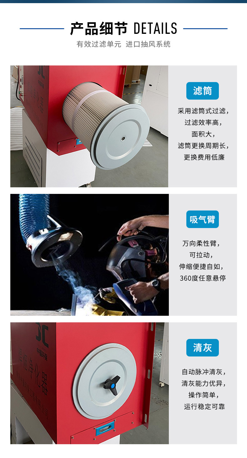 主要部件包括:萬向吸塵臂,耐高溫吸塵軟管、吸塵罩、阻燃高 效過濾筒、積灰抽屜、風機、電機以及電控箱等。