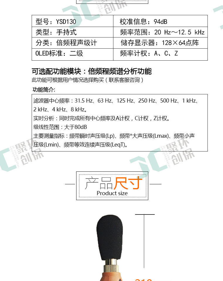 濾波器中心頻率:31.5 Hz、63 Hz、125 Hz、250 Hz、500 Hz、1 kHz、2 kHz、4 kHz、8 kHz。
