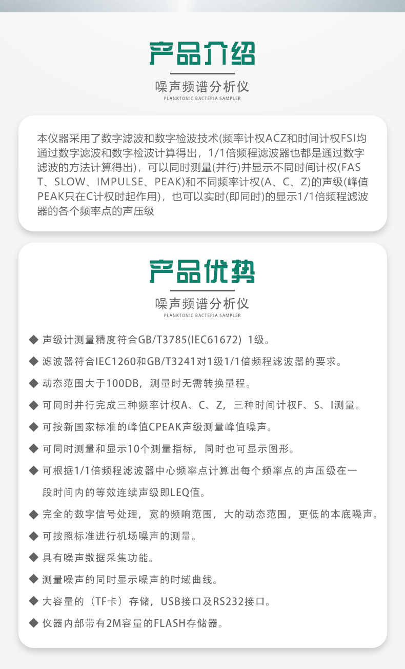 本儀器采用了數字濾波和數字檢波技術(頻率計權ACZ和時間計權FSI均通過數字濾波和數字檢波計算得出,1/1倍頻程濾波器也都是通過數字濾波的方法計算得出),可以同時測量(并行)并顯示不同時間計權(Fast、Slow、Impulse、Peak)和不同頻率計權(A、C、Z)的聲級(峰值Peak只在C計權時起作用),也可以實時(即同時)的顯示1/1倍頻程濾波器的各個頻率點的聲壓級。儀器具有可靠性高、穩定性好、動態范圍寬等優點。本儀器采用160×160點陣式液晶顯示器并帶背景光顯示,有中英文兩種操作界面,顯示內容豐富,用戶操作簡便。測量結果可長期保存在儀器內,通過內置RS-232接口在現場或事后用微型打印機打印出來或送到計算機中去處理。