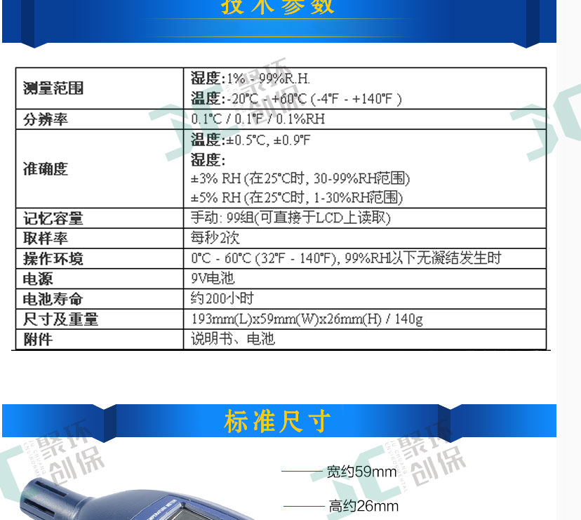3.濕度:±3% rh (在25℃時, 30-99%rh范圍)、±5% rh (在25℃時, 1-30%rh范圍)