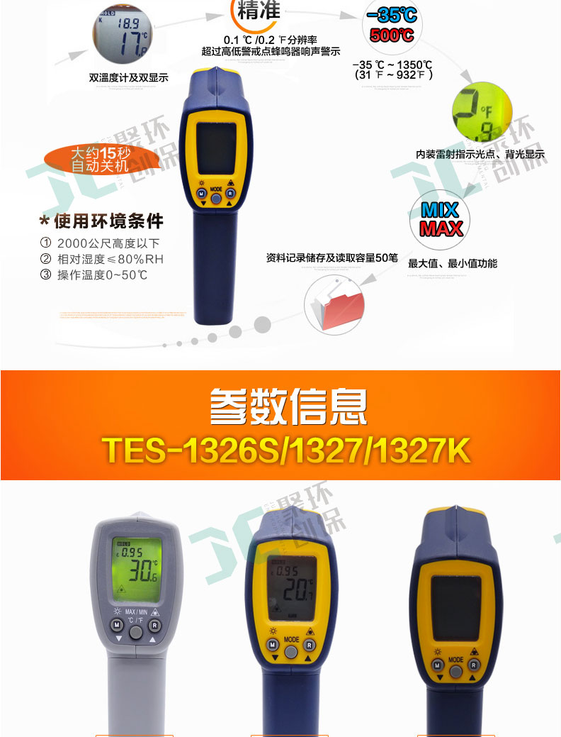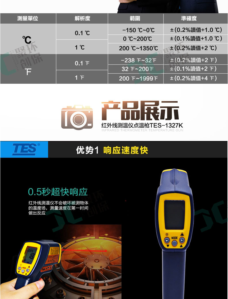 TES-1327K-USB紅外線測溫儀可選擇℃/℉單位 *大值、*小值功能 溫度測量范圍 -20℃~+500℃ 內裝雷射指示光點、背光顯示 距離與目標比 12:1; 25mm*小點尺寸 0.1℃/0.2℉分辨率 固定 0.95。