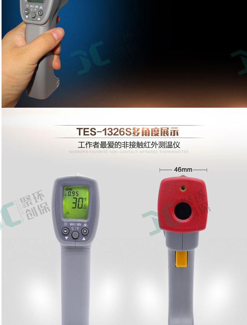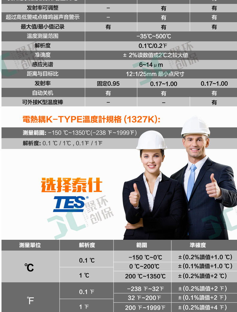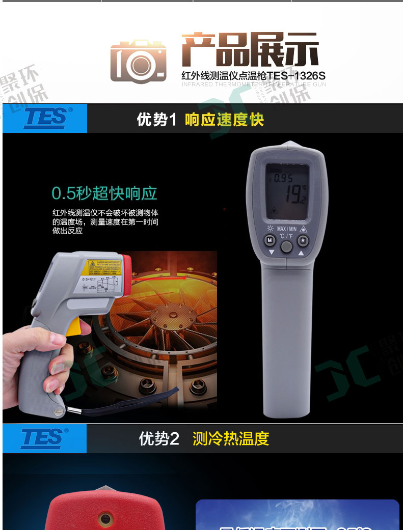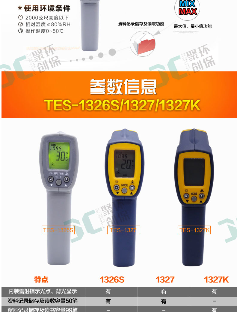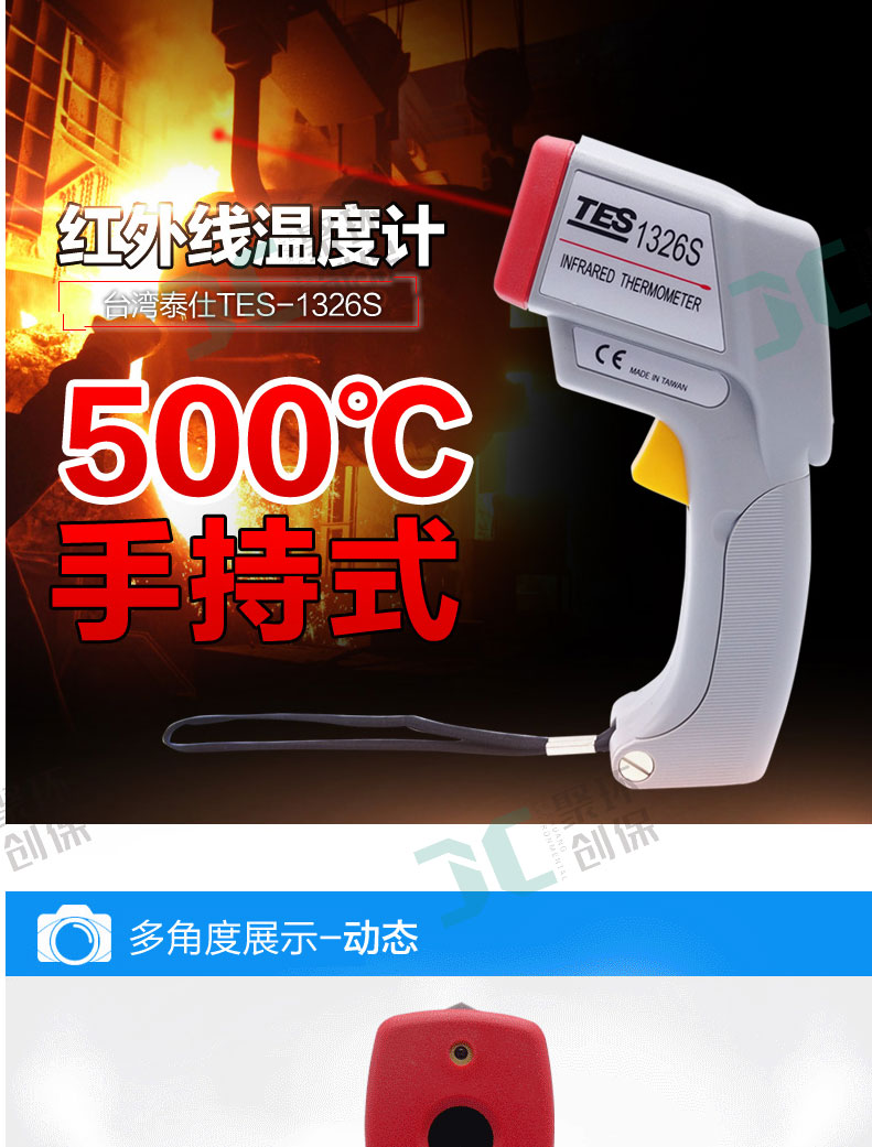 TES-1326S紅外線測溫儀可選擇℃/℉單位 *大值、*小值功能 溫度測量范圍 -20℃~+500℃ 內(nèi)裝雷射指示光點、背光顯示 距離與目標比 12:1; 25mm*小點尺寸 0.1℃/0.2℉分辨率 固定 0.95。