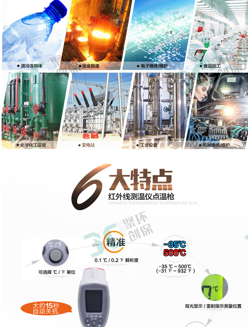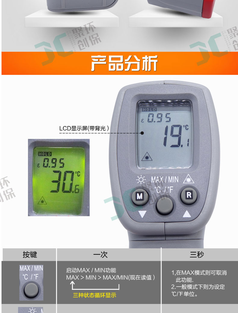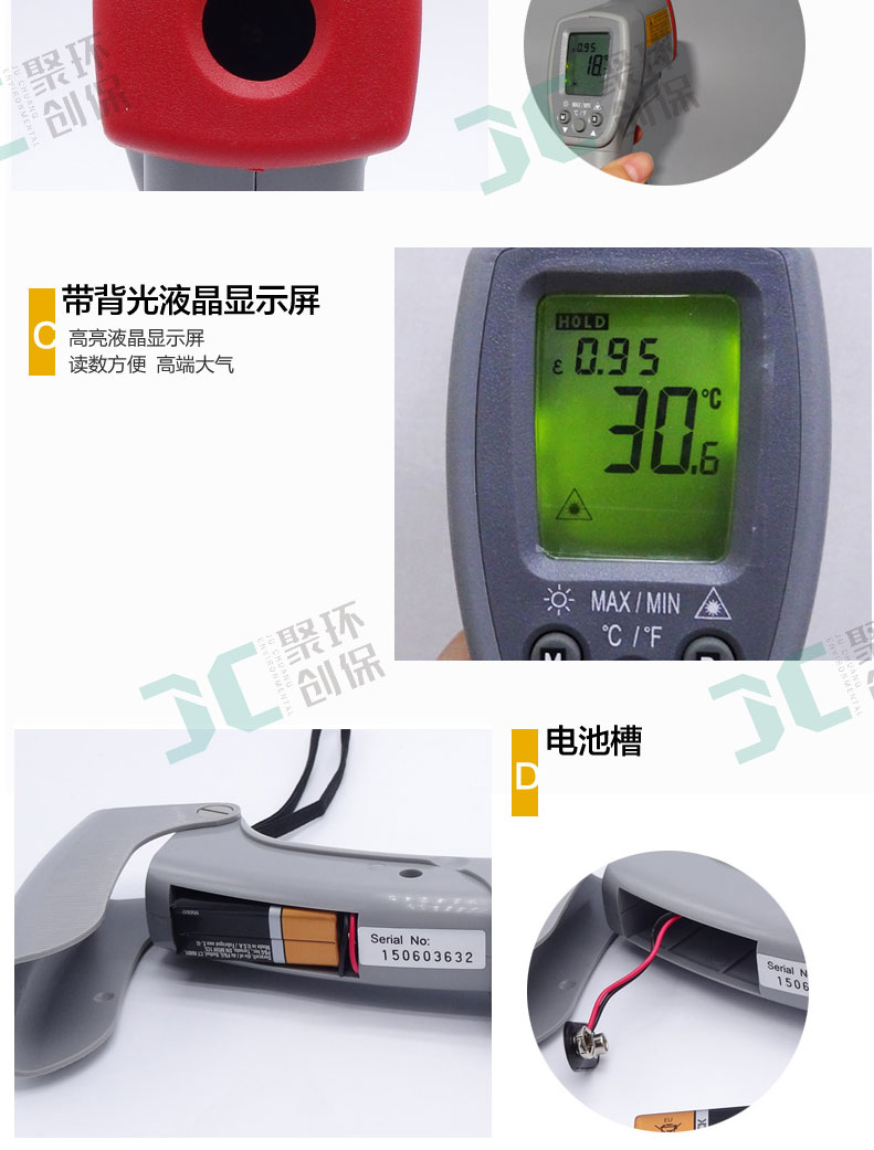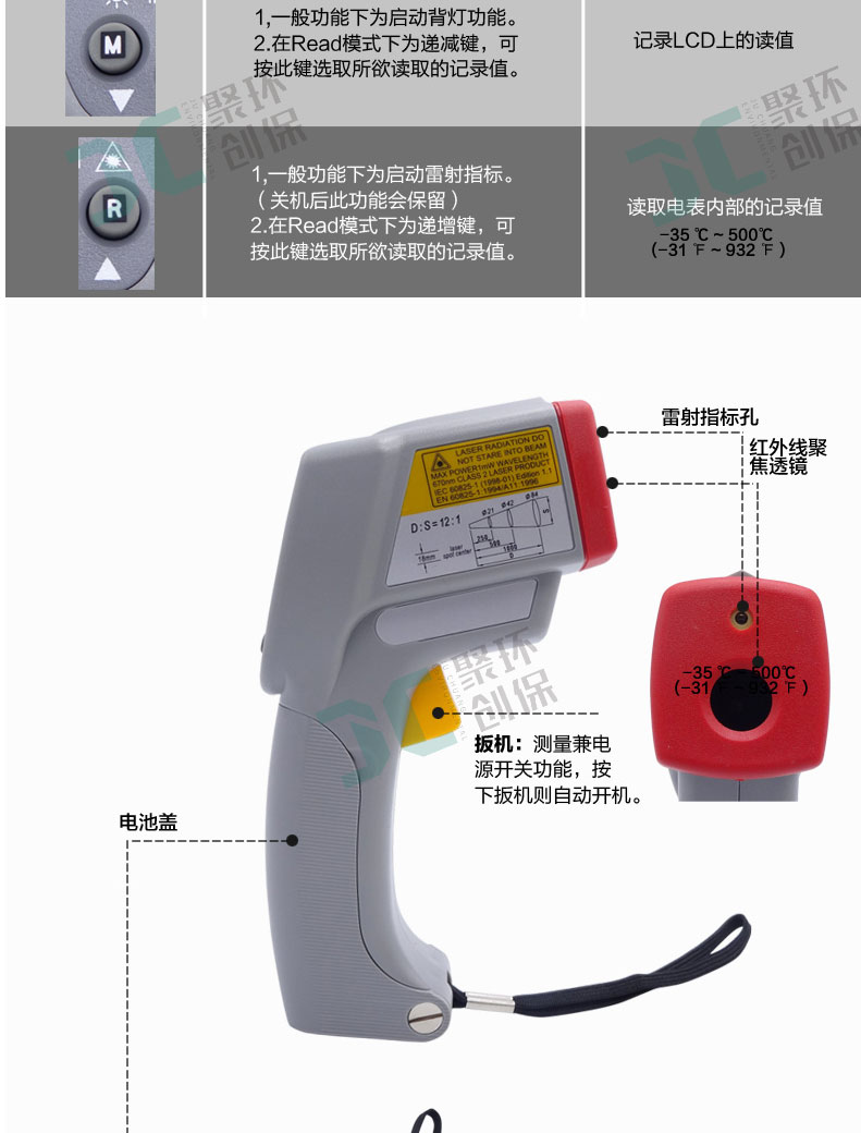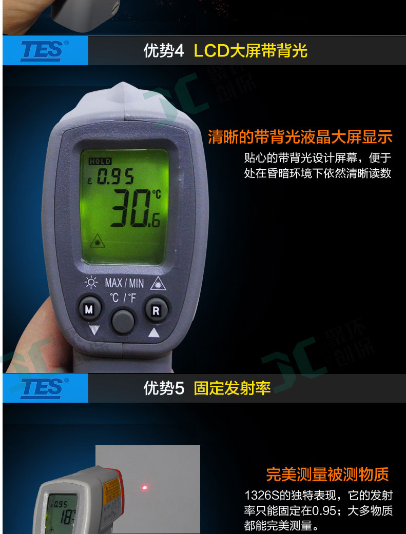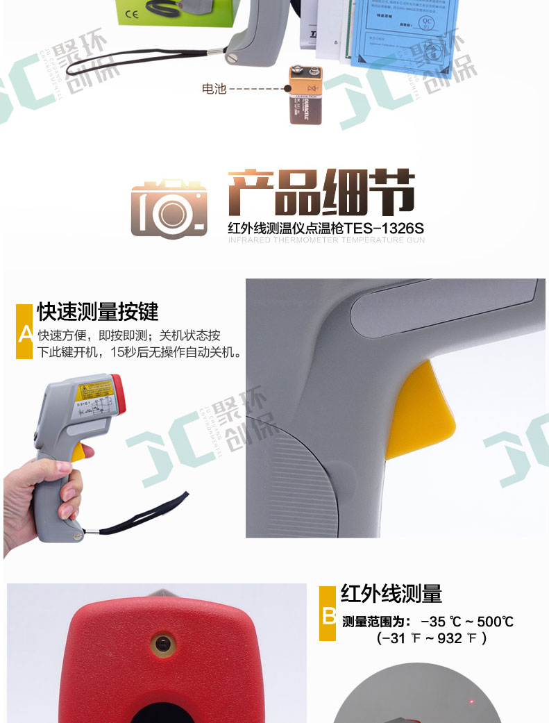 TES-1326S紅外線測溫儀可選擇℃/℉單位 *大值、*小值功能 溫度測量范圍 -20℃~+500℃ 內(nèi)裝雷射指示光點、背光顯示 距離與目標比 12:1; 25mm*小點尺寸 0.1℃/0.2℉分辨率 固定 0.95。