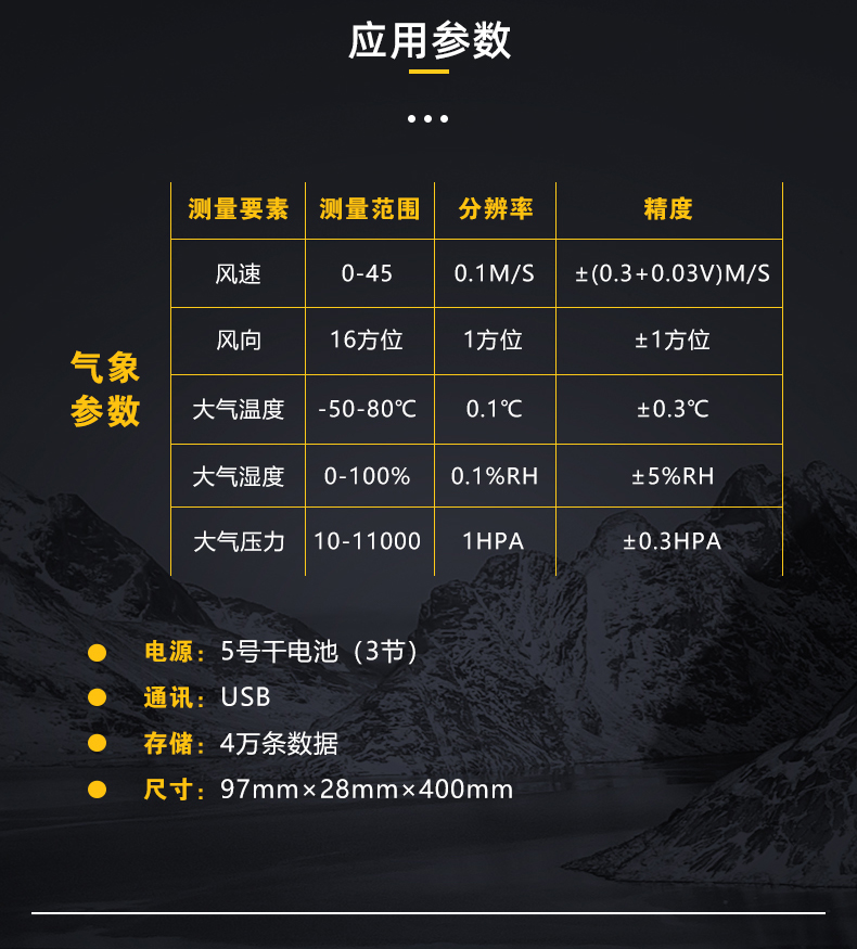 測量大量的參數(shù)要求,如風(fēng)速、溫度、濕度、氣壓、海拔、濕球溫度、風(fēng)寒、熱力指數(shù)等可選擇NK5500,配套含風(fēng)向標(biāo)。三腳架、USB數(shù)據(jù)下載模塊,是屬于高配產(chǎn)品。