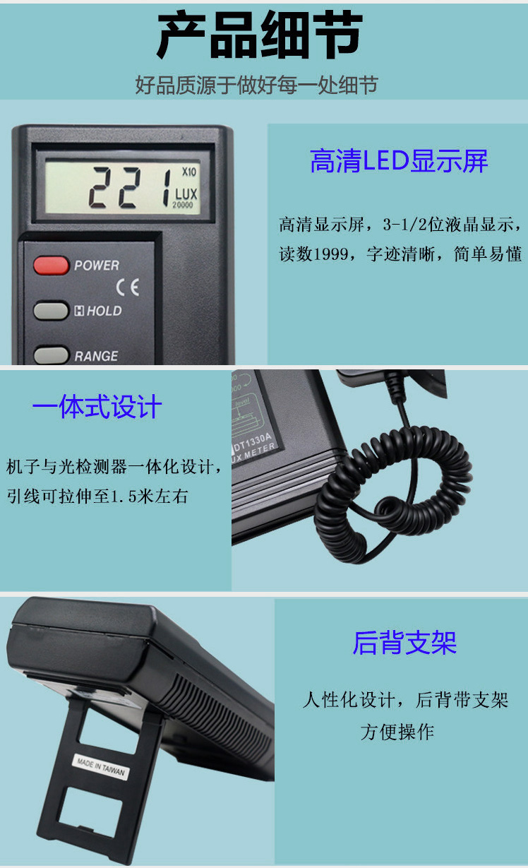TES-1339:測量范圍0.01Lux至999900 Lux,具有均值測量 / 照度積分測量、發強度測量、扣除雜散光之光源照度測量、間設定自動鎖定測量等功能。