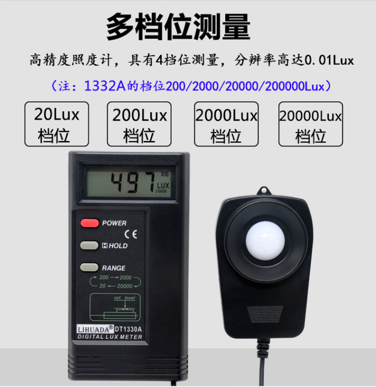 TES-1330A:測量范圍:20/200/2000/20000Lux,量程自動轉換。