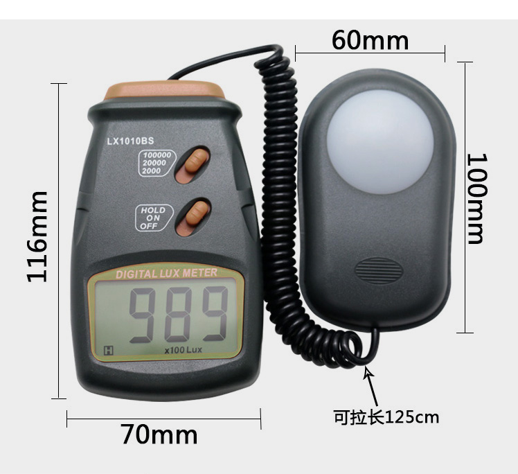 3、測量范圍自0.01Lux至999900 Lux、0.001fc至99990 fc,計5檔自動換檔