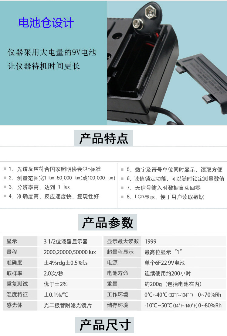 TES-1332A:測量范圍:200/2000/20000/200000 Lux ,量程自動轉換。