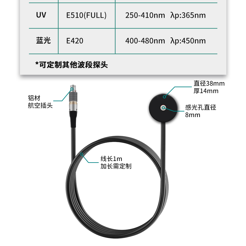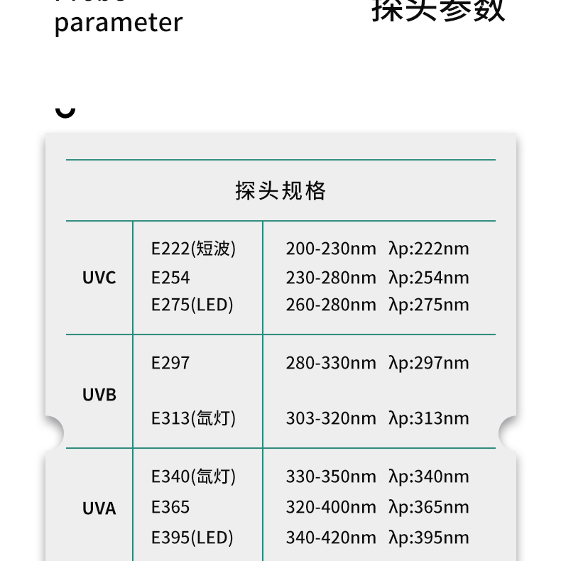 9、E510(UVA FULL)波長范圍:250-410nm、峰值波長:365nm