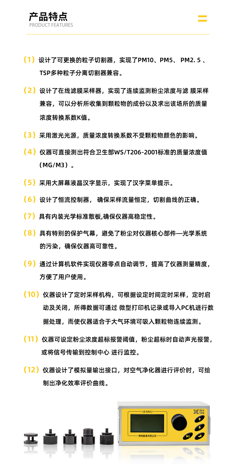 儀器具有顆粒物濃度連續監測、定時采樣以及粉塵濃度超標報警等多種功能。備有PM10、PM5、PM2.5、PM1.0及TSP切割器供選擇.儀器采用了