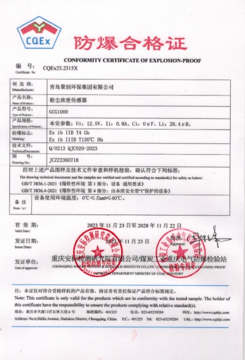GCG-1000C)防爆型粉塵監測系統吸收消化了國內外先進的測塵技術,可連續檢測存在易燃易爆可燃性氣體混合物的環境中浮游粉塵的濃度,具有測量快速準確、靈敏度高、就地顯示、遠程信號傳輸、性能穩定、可預置K值等功能及特點,可與各種監控系統配套使用。