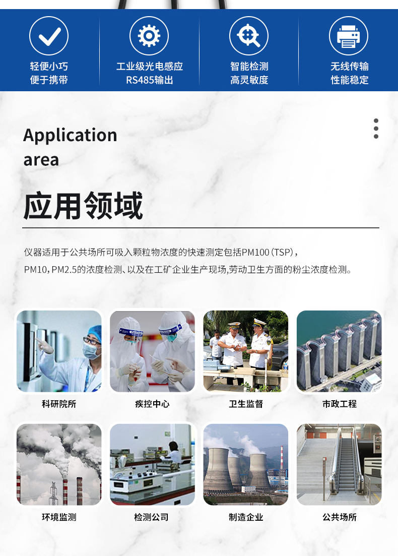 2、分辨率高:≥0.3um顆粒粒徑,0.001mg/m3;檢測PM2.5、PM10、TSP;