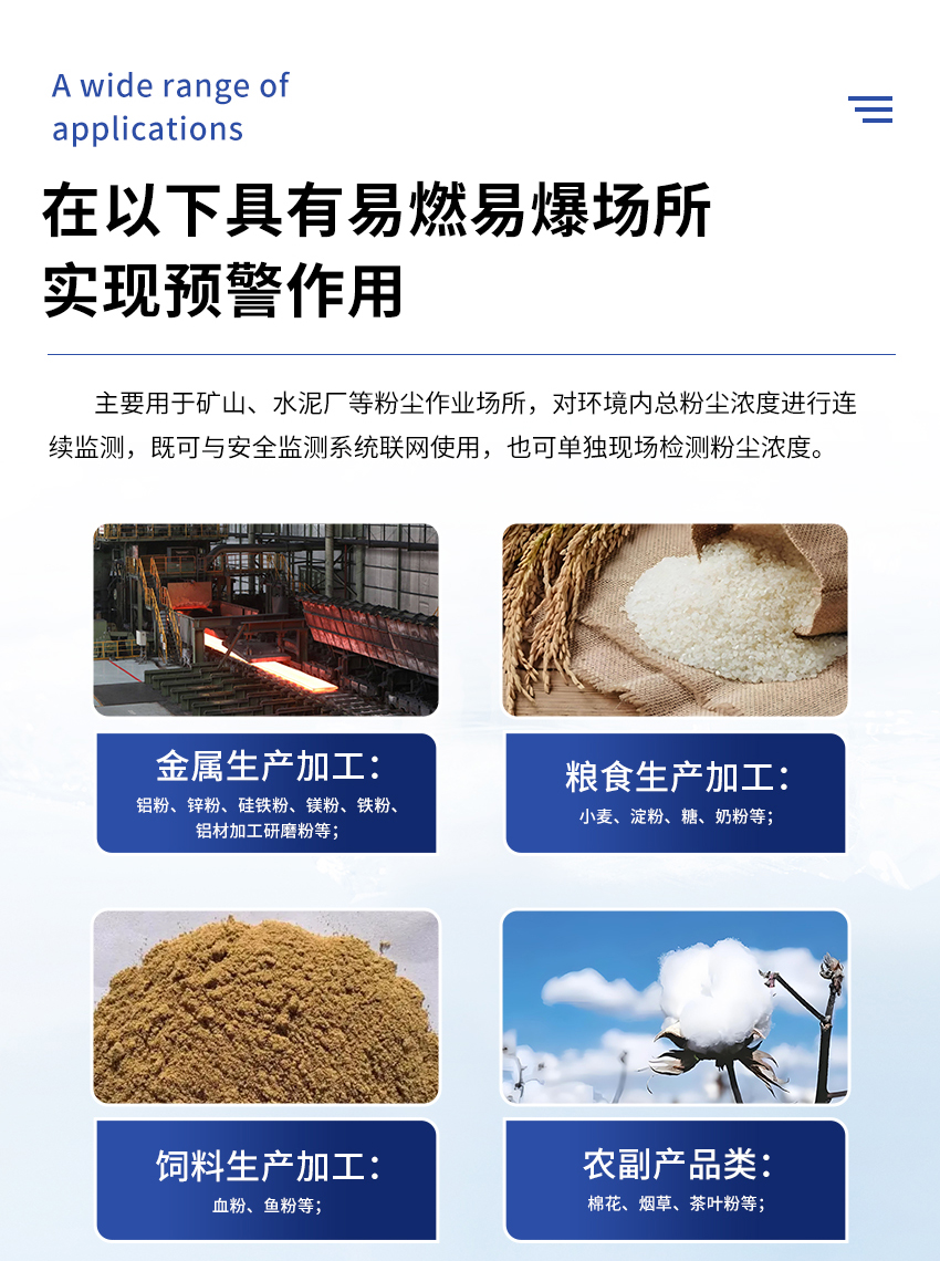 該系統(tǒng)適用范圍廣泛,不僅適用于存在易燃易爆可燃性氣體混合物的工作環(huán)境中對(duì)作業(yè)場(chǎng)所總粉塵進(jìn)行連續(xù)監(jiān)測(cè),還適用于其他公共場(chǎng)所的環(huán)境監(jiān)測(cè)。