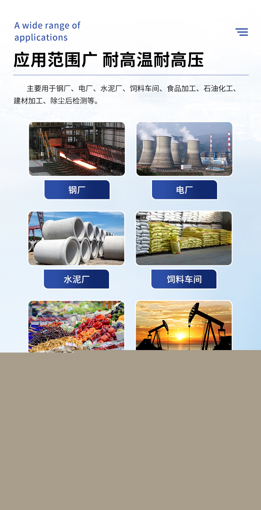 靜電粉塵檢測儀廣泛應用于各種工業用途,包括:煉鋼、發電、石油、化工、醫藥、建材加工、采煤和采礦、水泥制造和包裝等行業。典型用途包括布袋除塵器濾袋破損的探測,或粉狀材料回收、產品輸送總量監測,或各種大小、各種燃料的鍋爐煙塵排放濃度監測。