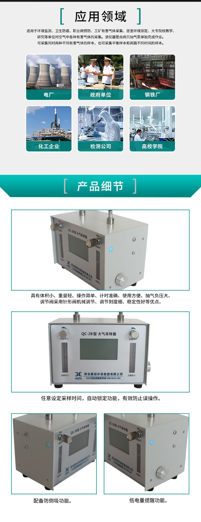 QC型大氣采樣器,它是對空氣中一種或兩種有害氣體同時采樣的儀器。該儀器是由一只或兩只抽氣泵單獨完成作業。可以根據配制不同的溶液采集不同的氣體。