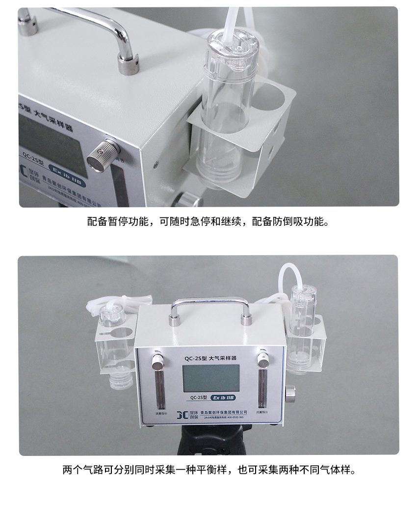QC型大氣采樣器,它是對空氣中一種或兩種有害氣體同時采樣的儀器。該儀器是由一只或兩只抽氣泵單獨完成作業。可以根據配制不同的溶液采集不同的氣體。