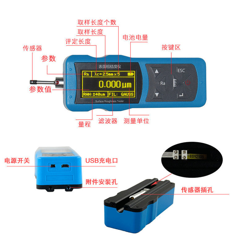 u 大量程,多參數,14種參數:Ra, Rz=Ry(JIS), Rq, Rt=Rmax, Rp, Rv, R3z, R3y, RzJIS, Rs, Rsk, Rku, Rsm, Rmr;