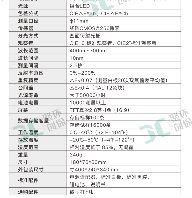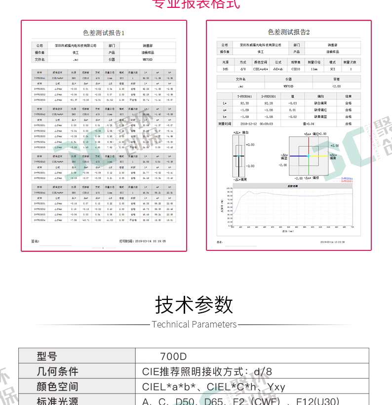 儀器中內置六種光源A、C、D50、D65、F2(CWF)和F12(U30)和三種顯色參數(L*a*b*、L*C*h*和Yxy),可滿足使用者的不同的顏色測量需求。