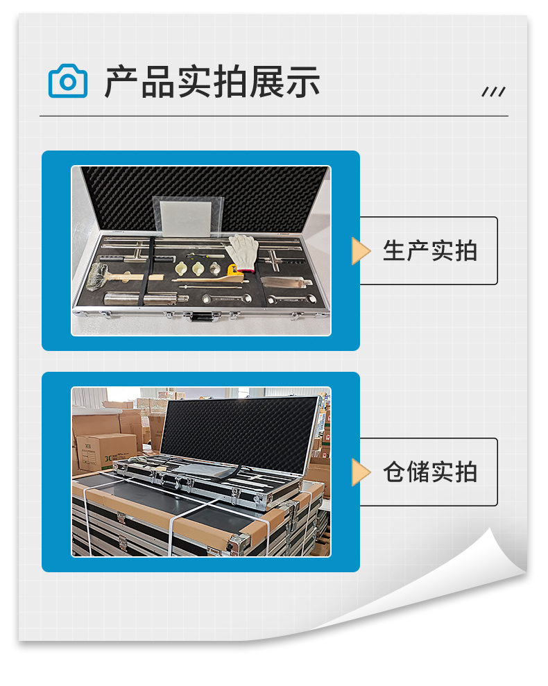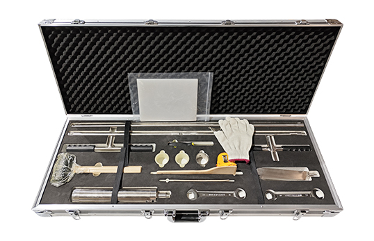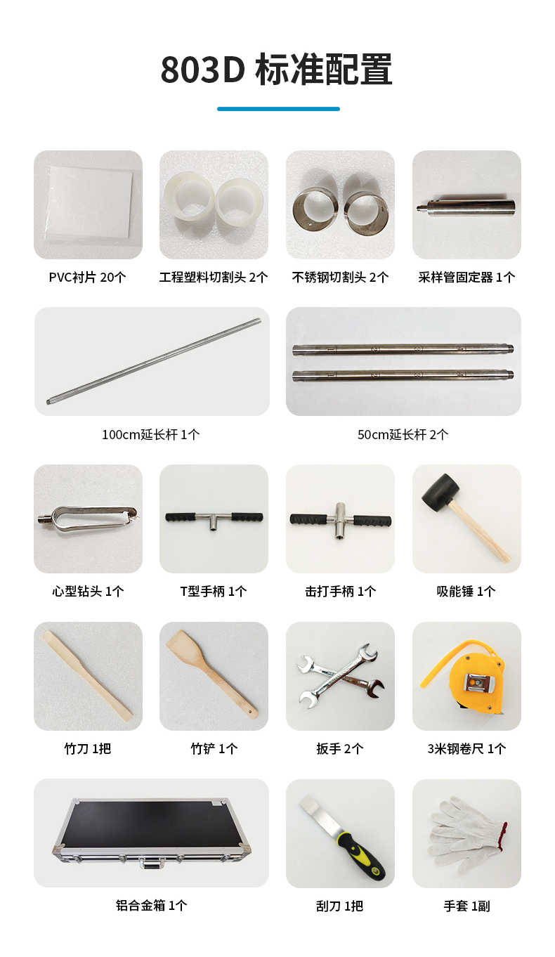 PVC襯片20個、工程塑料切割頭2個、不銹鋼切割頭2個、采樣管固定器1個、心型鉆頭1個、100cm延長桿1個、50cm延長桿2個、T型手柄1個、擊打手柄1個、吸能錘1個、竹刀1把、竹鏟1個、扳手2個、3米鋼卷尺1個、刮刀1把、手套1副、鋁箱1個