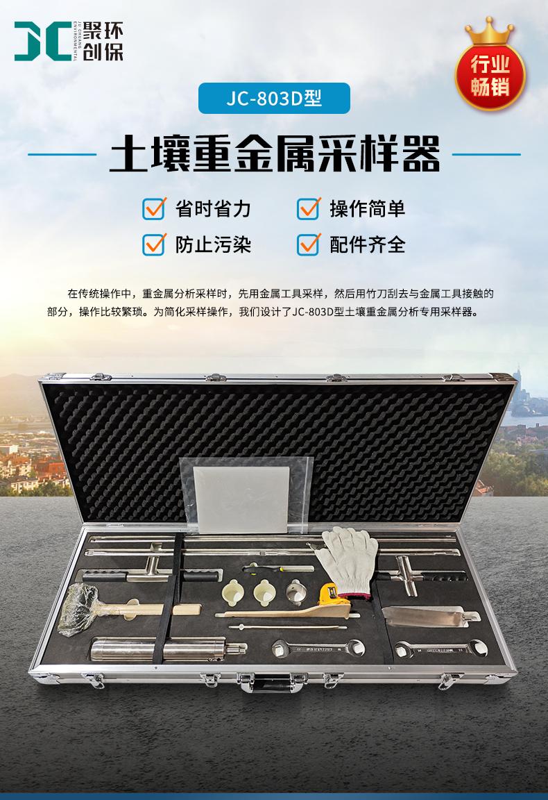 在傳統操作中,重金屬分析采樣時,先用金屬工具采樣,然后用竹刀刮去與金屬工具接觸的部分,操作比較繁瑣。為簡化采樣操作,我們設計了JC-803D型土壤重金屬分析專用采樣器。整套儀器體積小,操作簡單,裝配及拆卸都很方便,便于用戶戶外攜帶。