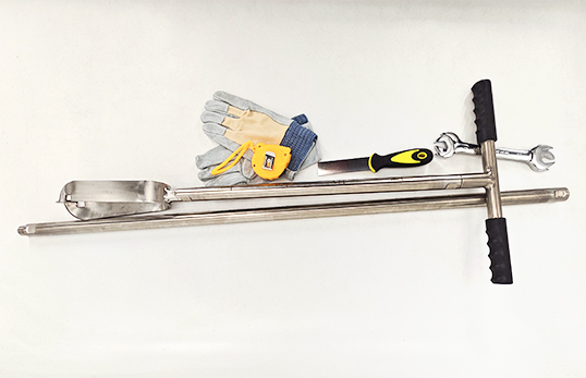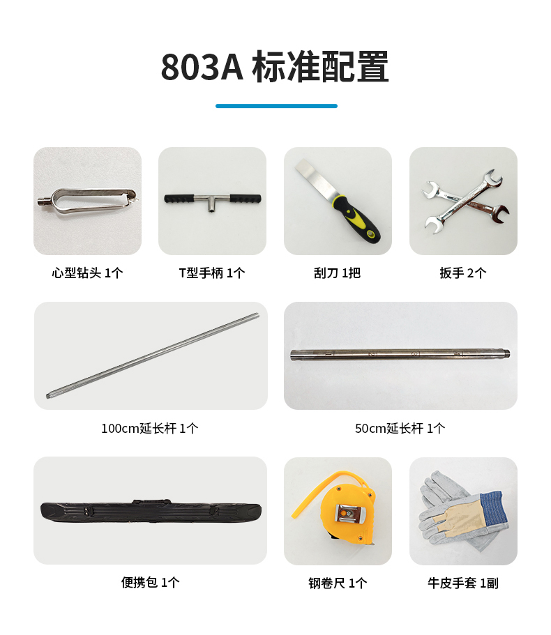 1個心型鉆頭,1個T型手柄,1個1米延長桿,1個0.5米延長桿,1把刮刀,2個扳手,1個鋼卷尺,1個便攜包
