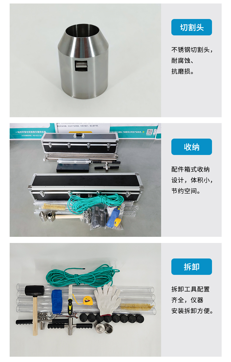 配重×3,尾翼×1,外六角螺絲套裝×6,繩子×1,不銹鋼套管×1,切割頭×1,不銹鋼固定裝置×1,采樣管×4,管帽×8,樣品推出器×1,鏟刀×1,扳手×2,手套×1,鋼卷尺×1,刷子×1,抹布×1,鋁合金箱×1
