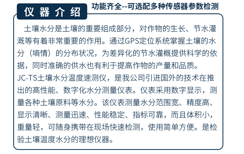 土壤水分濕度是土壤的重要組成部分,對作物的生長、節水灌溉等有著非常重要的作用。通過GPS定位系統掌握土壤的水分濕度(墑情)的分布狀況,為差異化的節水灌概提供科學的依據,同時準確的供水也有利于提高作物的產量和品質。JC-TS土壤水分濕度速測儀,是我公司引進國外的技術在推出的高性能、數字化水分測量儀表。儀表采用數字顯示,測量各種土壤原料等水分。該儀表測量水分范圍寬、精度高、顯示清晰、測量迅速、性能穩定、指標可靠,而且體積小,重量輕,可隨身攜帶在現場快速檢測,使用簡單方便。是檢驗土壤溫度水分濕度的理想儀器。