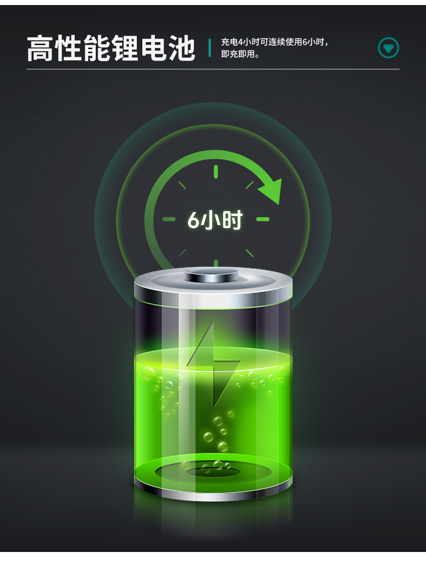3.高性能鋰電池,充電4小時(shí)可連續(xù)使用6小時(shí),即充即用。