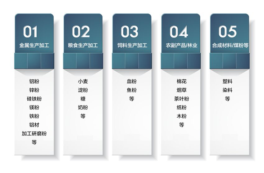 1、金屬生產(chǎn)加工:鋁粉、鋅粉、硅鐵粉、鎂粉、鐵粉、鋁材加工研磨粉等;