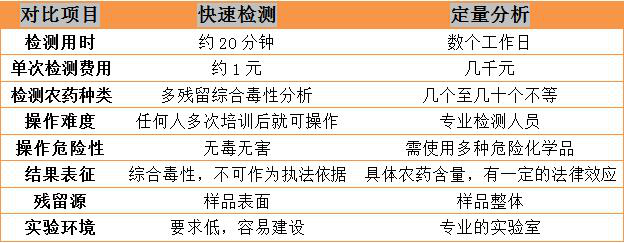 農藥殘留檢測方法分為快速檢測與定量分析,這兩種方法各有優缺點,綜合對比快速檢測方法更加具有應用前景。