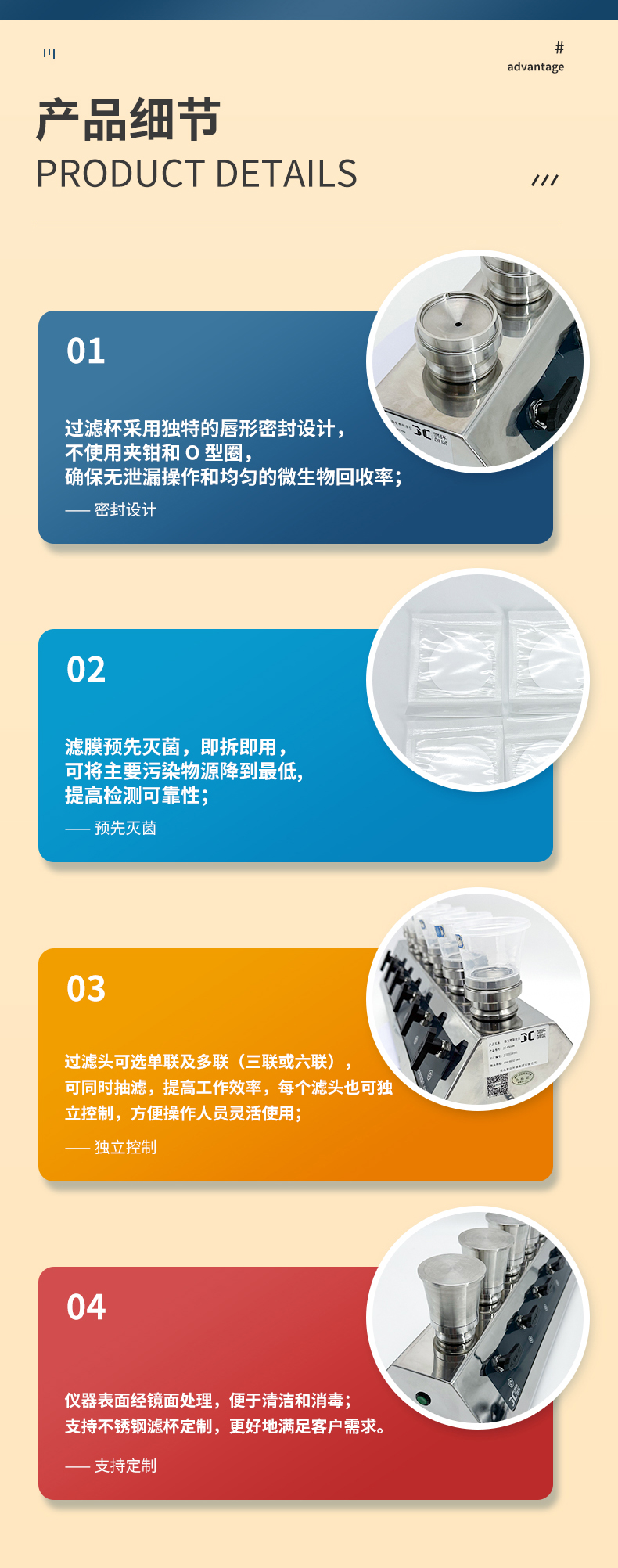 7、六聯過濾頭設計,可同時抽濾,提高工作效率,每個濾頭也可獨立控制,方便操作人員靈活使用;