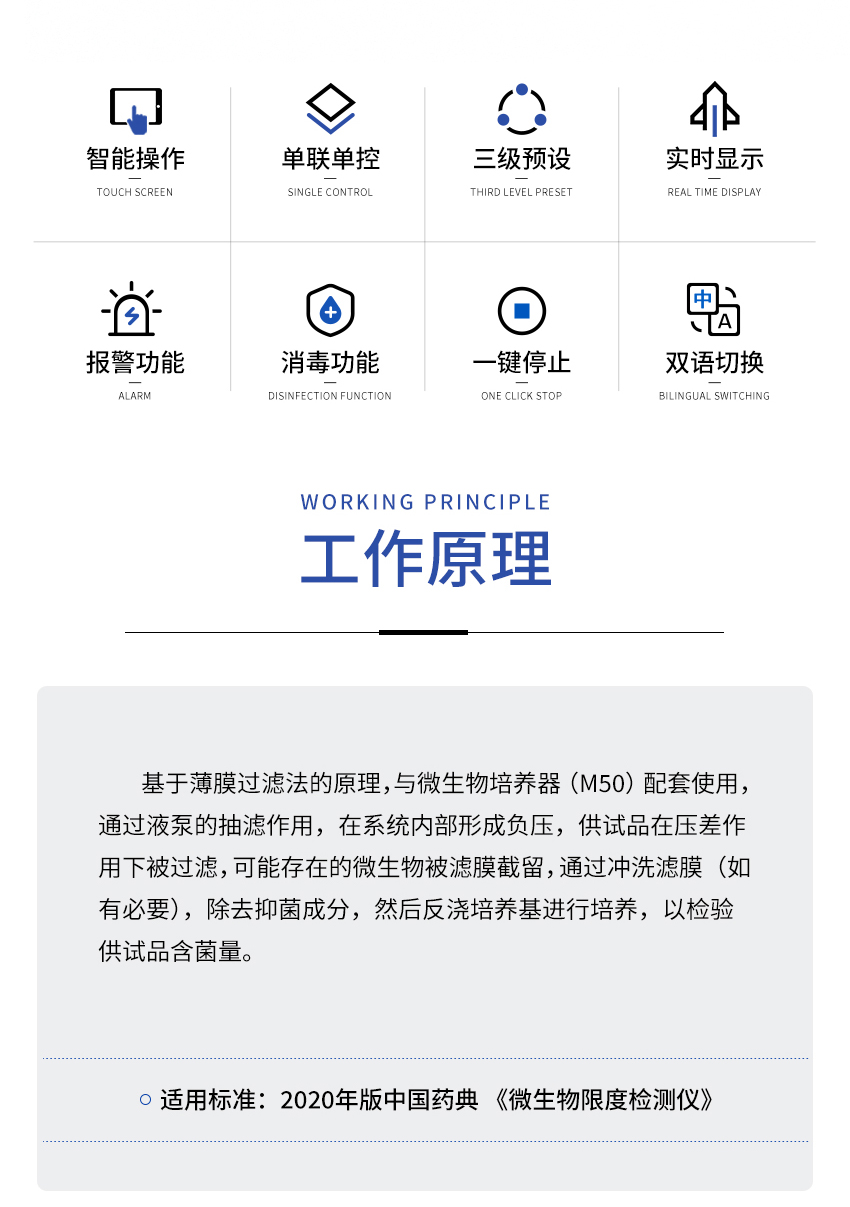 其工作原理為:將供試品注入微生物限度培養(yǎng)器內(nèi),借助檢驗(yàn)儀自帶的內(nèi)置進(jìn)口隔膜液泵產(chǎn)生的負(fù)壓進(jìn)行抽濾,使供試品中的微生物截留在濾膜上。之后,使用取膜器取出濾膜,并轉(zhuǎn)移至已配置好的固體培養(yǎng)基上,讓菌面朝上,平整貼合。蓋上蓋子形成封閉的培養(yǎng)盒,隨后將其放置在相應(yīng)的恒溫培養(yǎng)箱內(nèi)進(jìn)行培養(yǎng)并計(jì)數(shù)。