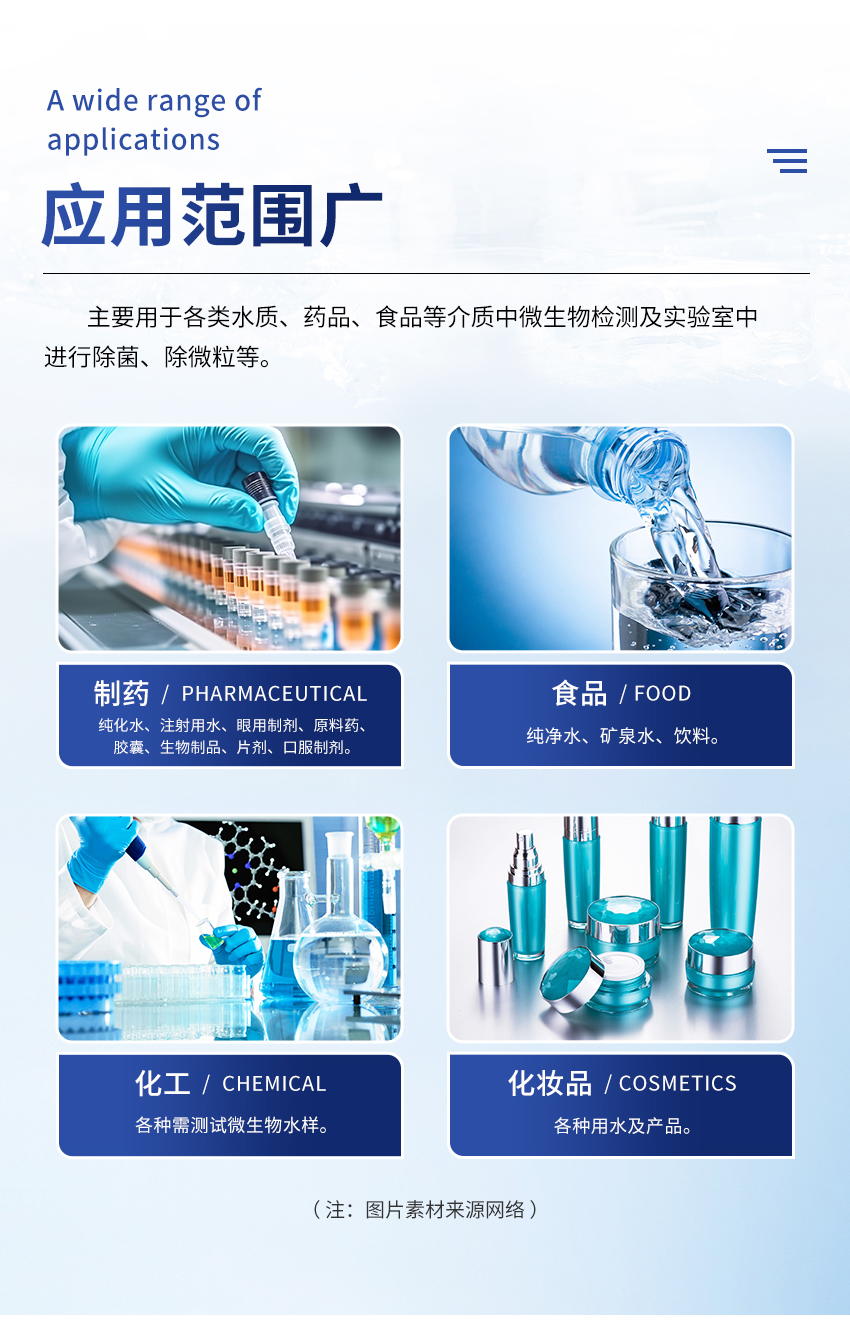 此類產(chǎn)品適用于水質(zhì),藥品、飲料等產(chǎn)品的微生物檢查。