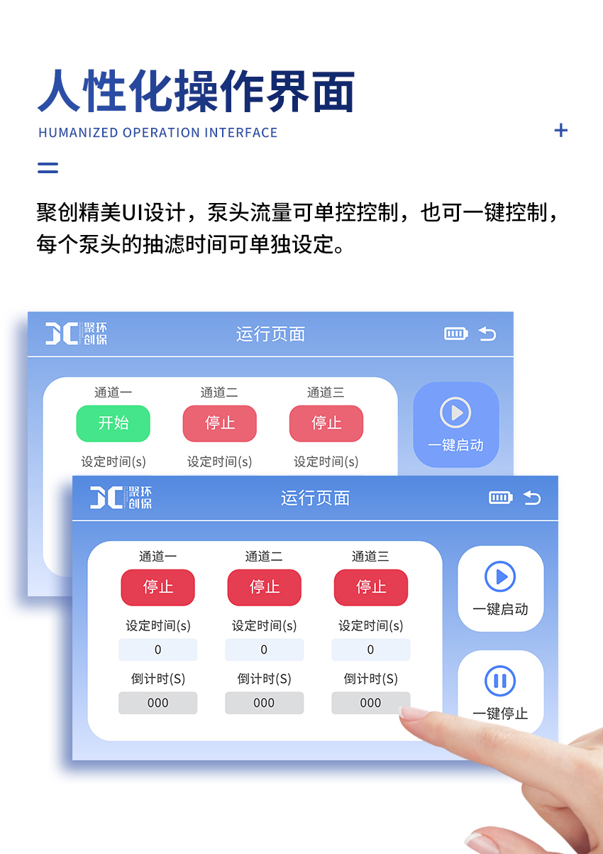 4.人性化操作界面:7寸全彩觸摸屏搭配聚創(chuàng)精美UI設(shè)計(jì),可控制單個(gè)泵頭流量,也可一鍵控制所有泵頭流量,每個(gè)泵頭的抽濾時(shí)間可單獨(dú)設(shè)定。