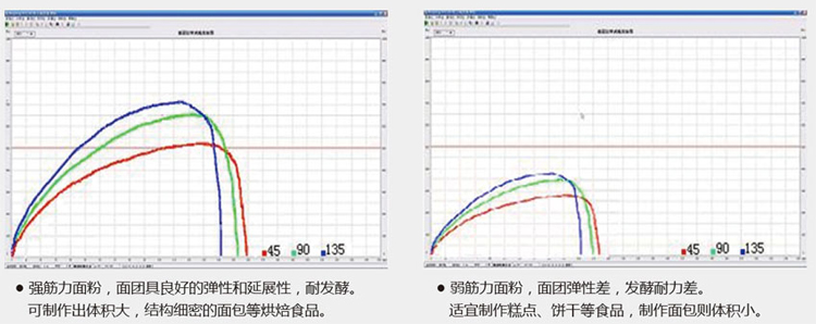 在規定條件下用粉質儀將小麥粉、水和鹽制備面團,分出150g 用拉伸儀的揉圓器揉圓,用成型器搓條使之成為標準形狀。放置一定時間后,拉伸測試面塊直至斷裂并由程序記錄所需的拉伸阻力。所得曲線的形狀和大小可以表征影響烘焙品質的小麥粉面團的物理特性。