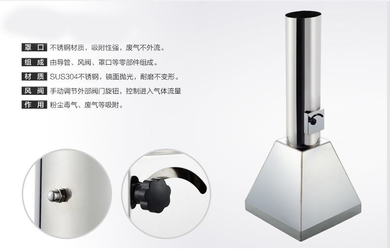 3、由氣流調(diào)節(jié)閥、風(fēng)門、伸縮導(dǎo)管、吸收罩頭等部分組成。