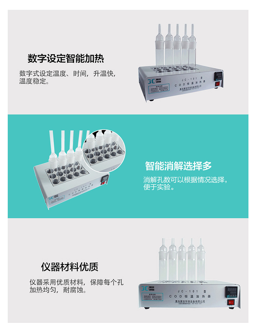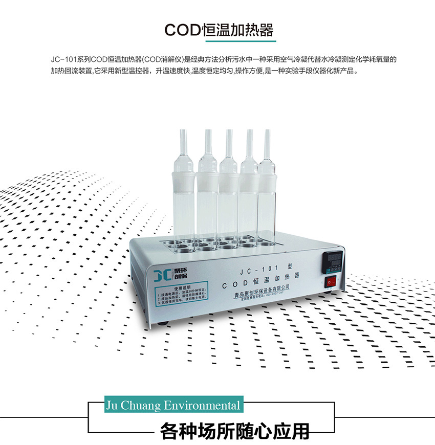 JC-101系列COD恒溫加熱器是經(jīng)典方法分析污水中一種采用空氣冷凝代替水冷凝測(cè)定化學(xué)耗氧量的加熱回流裝置,它采用新型溫控器,升溫速度快,溫度恒定均勻,操作方便,是一種實(shí)驗(yàn)手段儀器化新產(chǎn)產(chǎn)品。