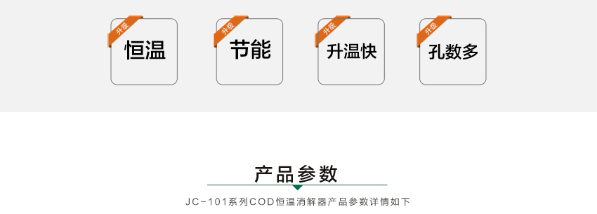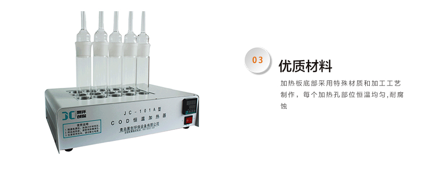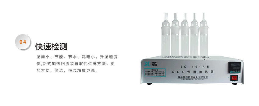 JC-101A型COD恒溫加熱器(COD消解儀)是經典方法分析污水中一種采用空氣冷凝代替水冷凝測定化學耗氧量的加熱回流裝置,它采用新型溫控器,升溫速度快,溫度恒定均勻,操作方便,是一種實驗手段儀器化新產產品。