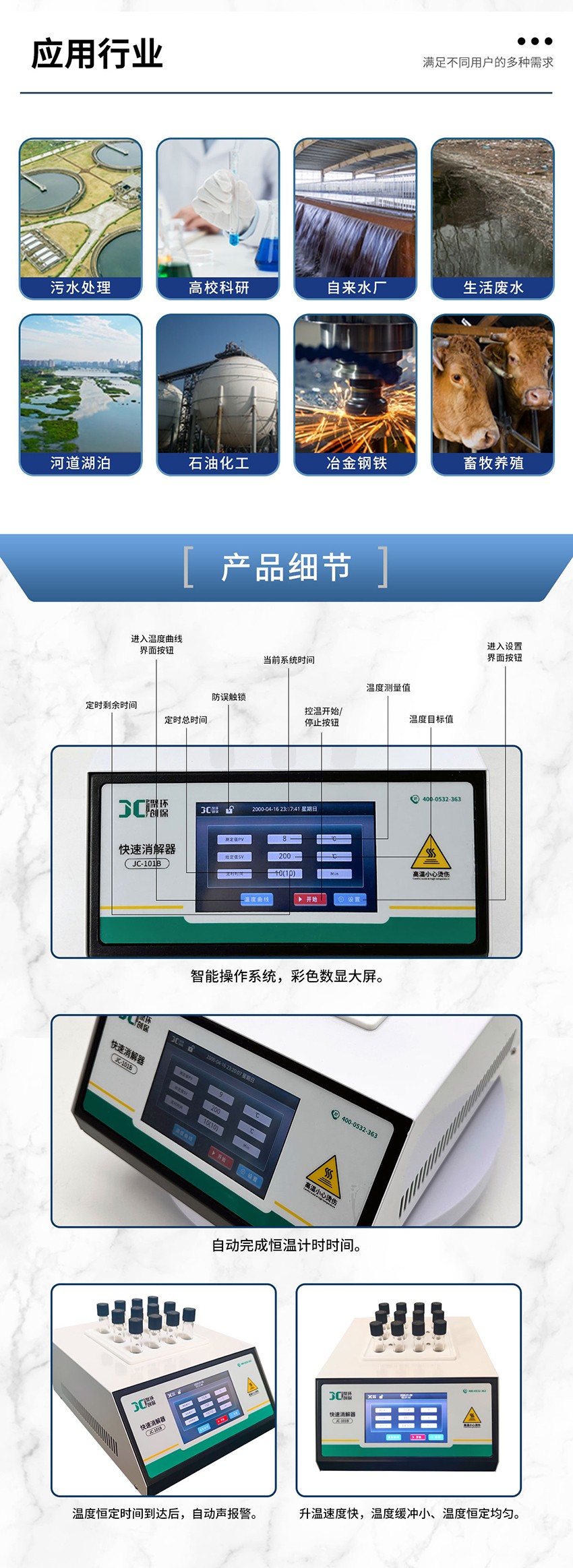 JC - 101B型COD快速消解儀是一種用于快速測定化學耗氧量的加熱裝置,可對COD、總磷、總氮等樣品進行消解預處理。