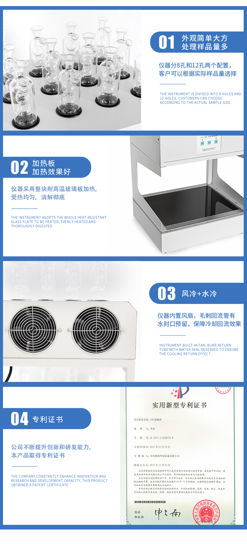 COD消解器是測定COD指標(biāo)時(shí)對水樣前處理的一款加熱裝置,其本身是不具有測定功能,該系列產(chǎn)品遵循國際標(biāo)準(zhǔn)(ISO)和國家標(biāo)準(zhǔn)(GB11914-89)的基本原則,保證其消解操作,試劑溶液的配置加入量都和國標(biāo)法一致,確保可靠準(zhǔn)確的分析結(jié)果,化學(xué)需氧量越大,說明水體受有機(jī)物的污染越嚴(yán)重。