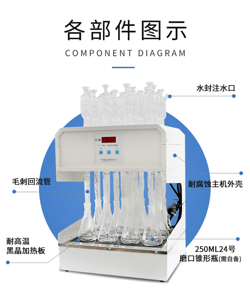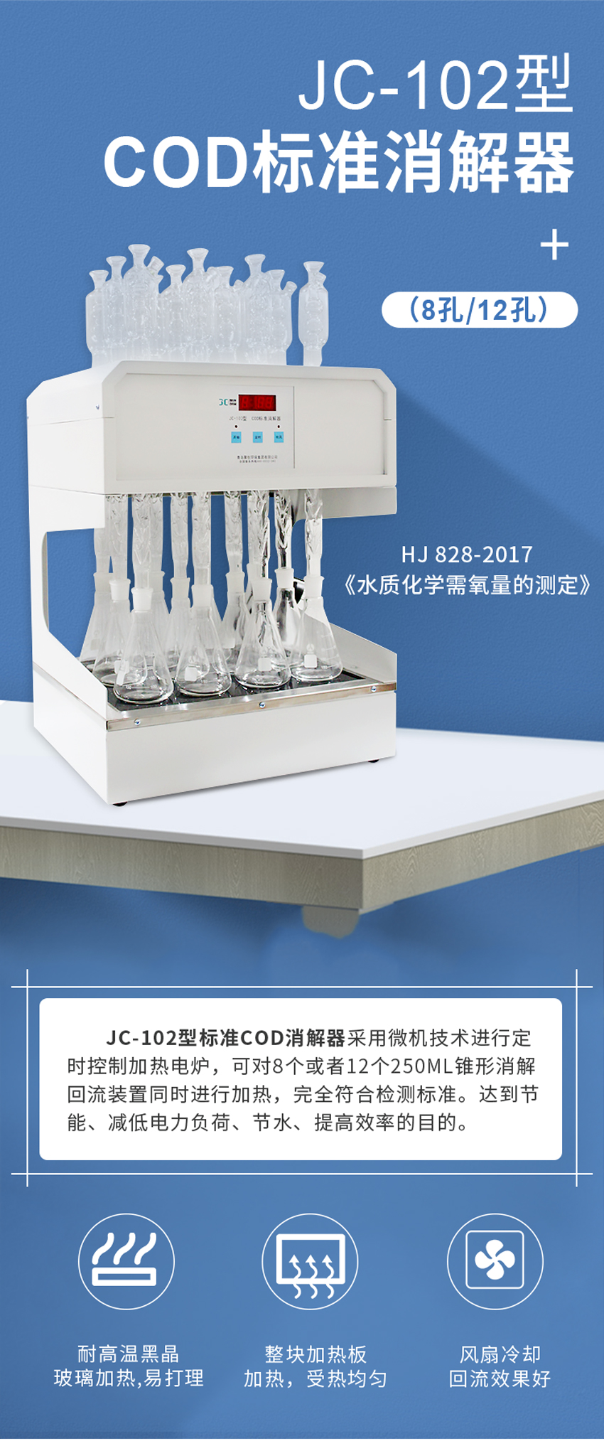 JC-102型標準COD消解器采用微機技術進行定時控制加熱電爐,可對8個250ml錐形消解回流裝置同時進行加熱。達到節能、減低電力負荷、節水、提高 效率的目的。