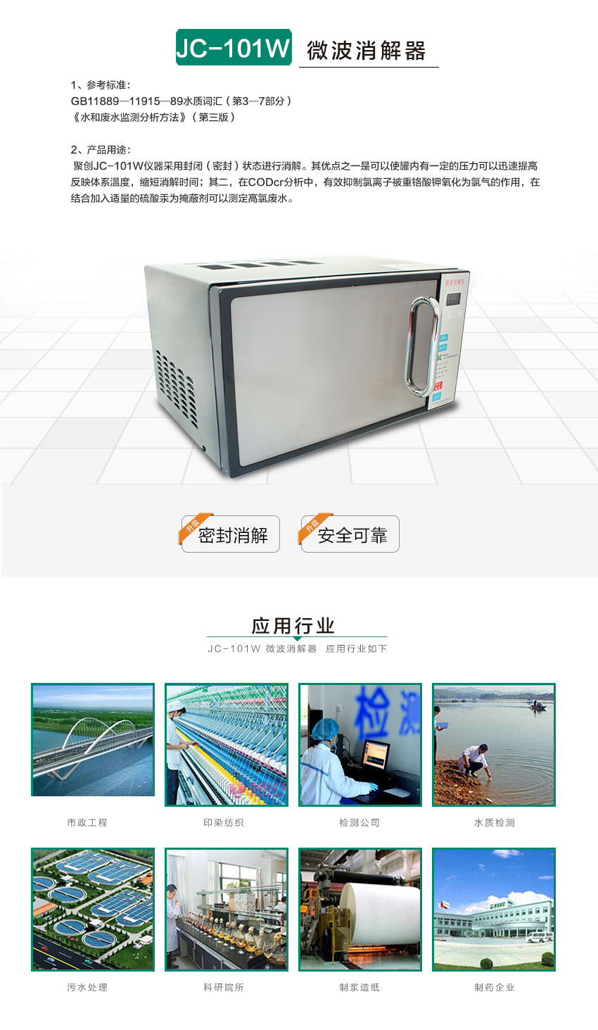我公司生產(chǎn)的聚創(chuàng)JC-101W儀器還采用在封閉(密封)狀態(tài)進行消解的方式。其優(yōu)點之一是可以使罐內(nèi)有一定得壓力以迅速提高反映體系溫度,縮短消解時間;其二,在CODcr分析中,有效抑制氯離子被重鉻酸鉀氧化為氯氣的作用,在結(jié)合加入適量的硫酸汞為掩蔽劑可以測定高氯廢水的微波密封消解 COD 快速測定儀,是迄今為止國內(nèi)較新型的專門用于監(jiān)測各種廢水,生活污水和地表水化學(xué)需氧量的裝置。