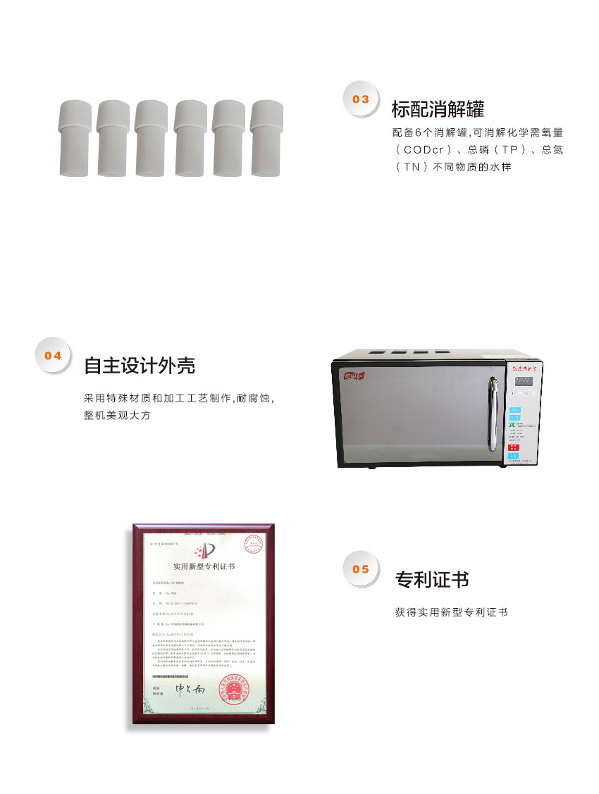 1、消解范圍:CODcr:5—2500mg/L,TP:0.01—0.6mg/L ,TN:0.05---4mg/L