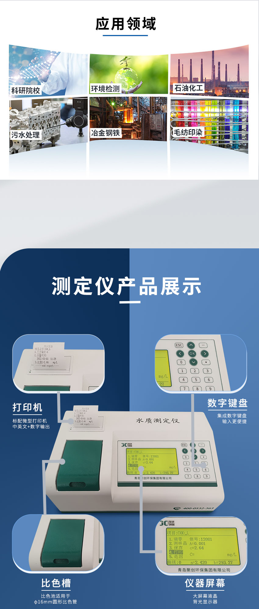 聚創JC-TP-100M型便攜式總磷測定儀依據GB/T 11893 水質 總磷的測定 鉬酸銨分光光度法》設計并開發,能準確快速測定水樣的總磷指標,適用于檢測地表水、地下水等一般環境水樣和中輕度污染廢水水樣。可廣泛應用于環保監測站、污水處理廠、大專院校、科研院所、石化、造紙、印染、電子、電力、鋼鐵、農業、市政工程等行業。