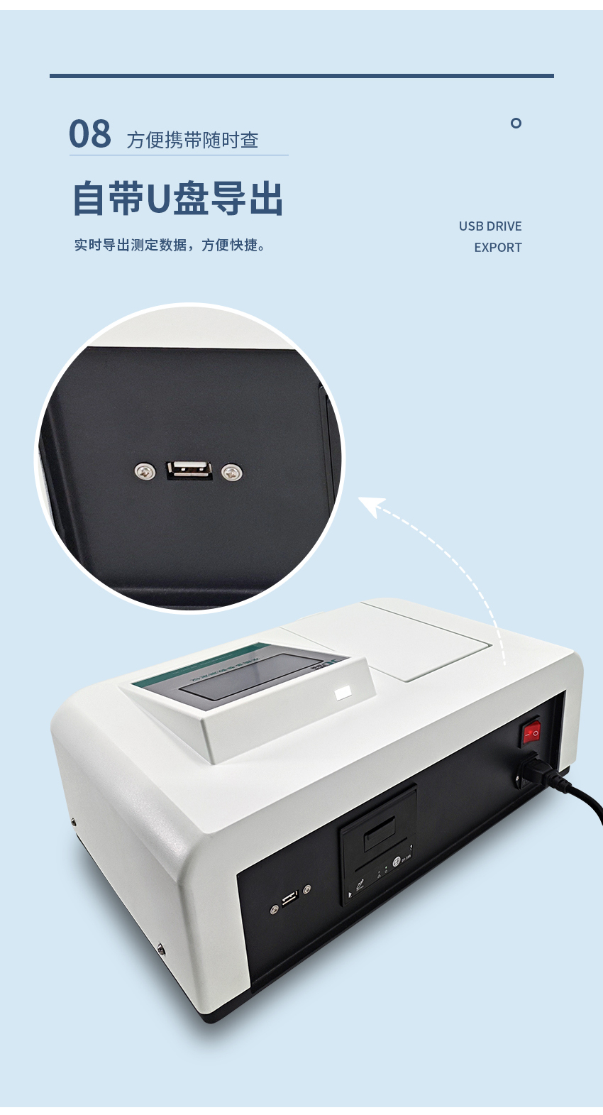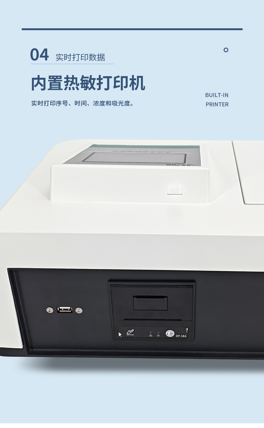 10. 多樣數據輸出:標配微型打印機,既可以即時打印當前數據,也能夠隨時查詢并打印已保存的數據。同時配備USB數據傳輸接口,能夠快速地將數據保存至U盤。