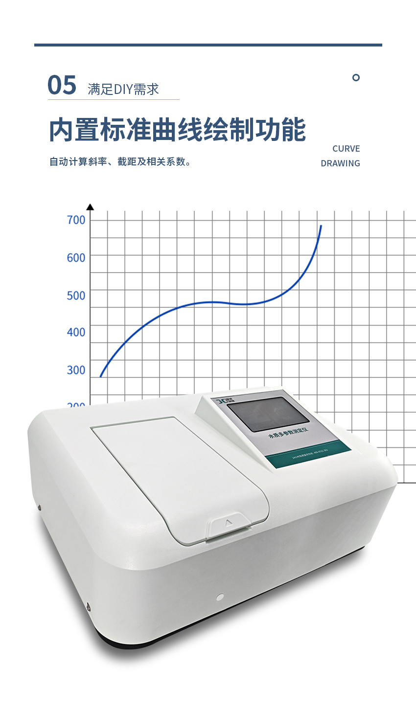 7. 智能曲線繪制:儀器內置標準曲線繪制功能,可自動計算斜率、截距以及相關系數,滿足用戶的DIY需求。