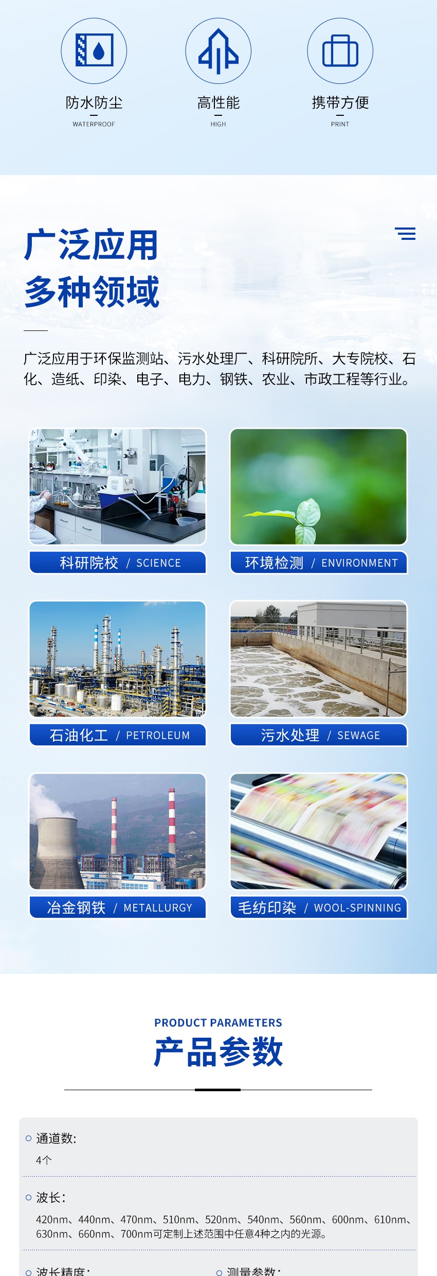 2、波長:420nm、440nm、470nm、510nm、520nm、540nm、560nm、600nm、610nm、630nm、660nm、700nm可定制上述范圍中任意4種之內(nèi)的光源。